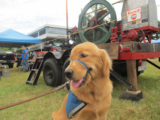 Along with the tractors, there were these things called "engines".. a number of people had their engines running, and they made this hissing and popping noise. That didn't bother me in the least... and Mom even had me practice some "sit/stays" right near them. I mainly wanted some water and a cool place.... never mind the engines....