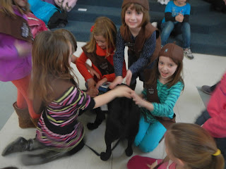 Mom allowed me to go "out of work mode" and gave me time to smooze with all the girls.... I got tons of hugs and kisses... but then I had to settle down (and the girls did too) while Mom gave a little talk about being a puppy raiser and the jobs that service dogs do. I laid quietly at her feet while she talked, just to show the girls how good I can be. (No one believed that I am just 8 months old!!!)